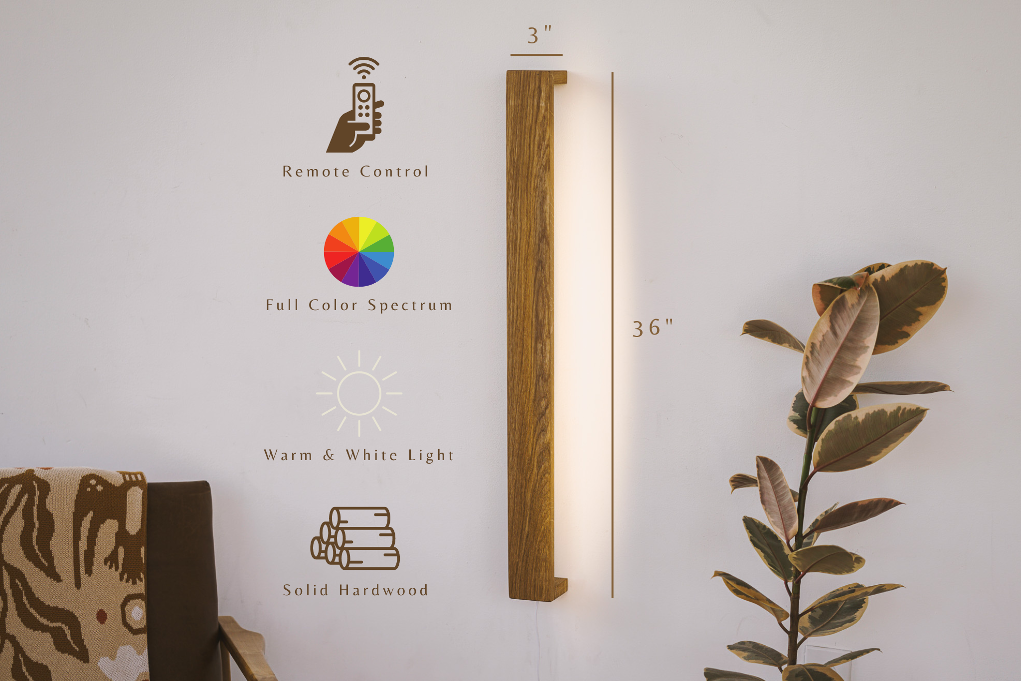 Display functional art in your home. This Modern and Minimalist LED wall mounted atmosphere light offers an aesthetically clean way to bring ambient light to any room of your house. Built with Black American Walnut or White Oak. The wood is hand-finished with several coats of natural oils and wax.